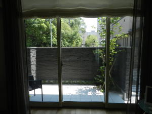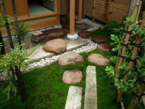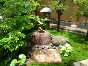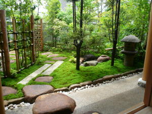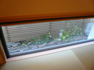 | 縦格子スクリーンを滝に見立てた前庭 |