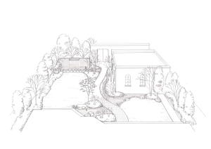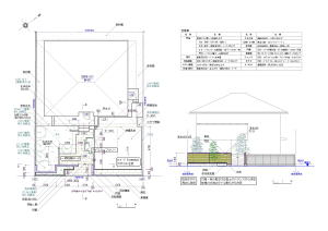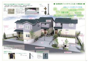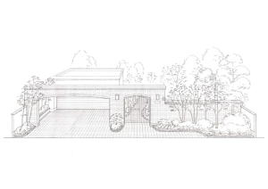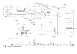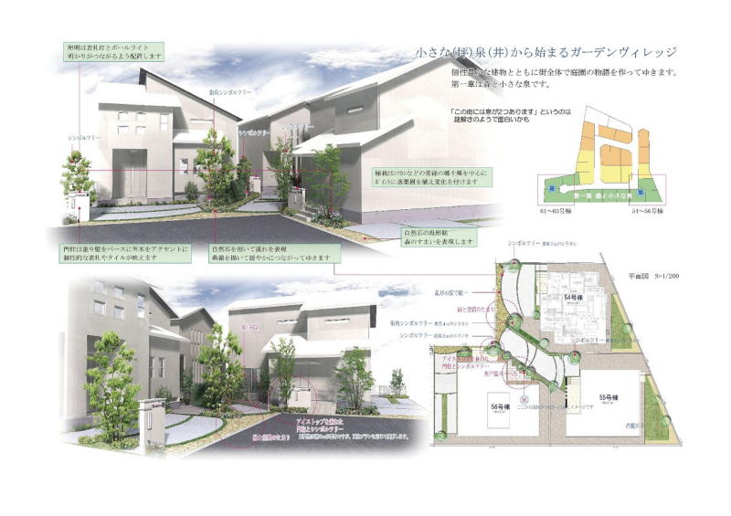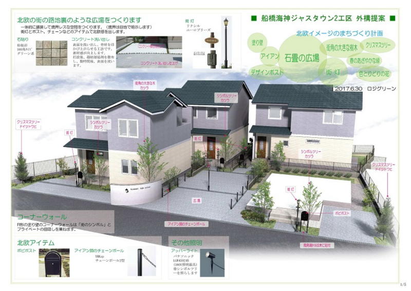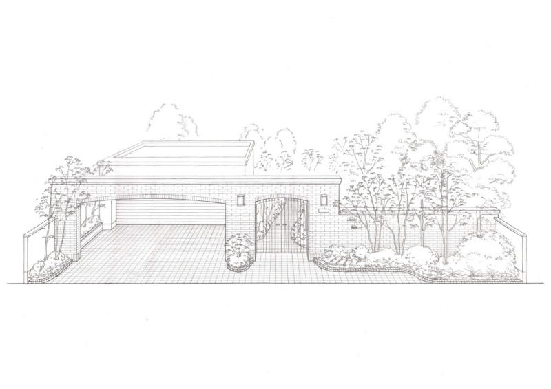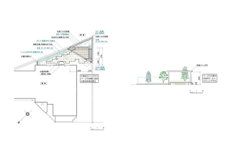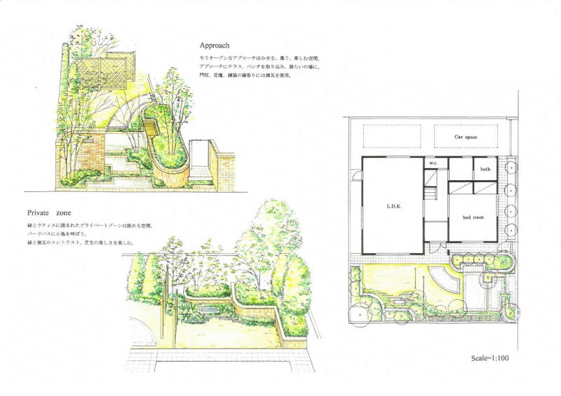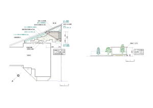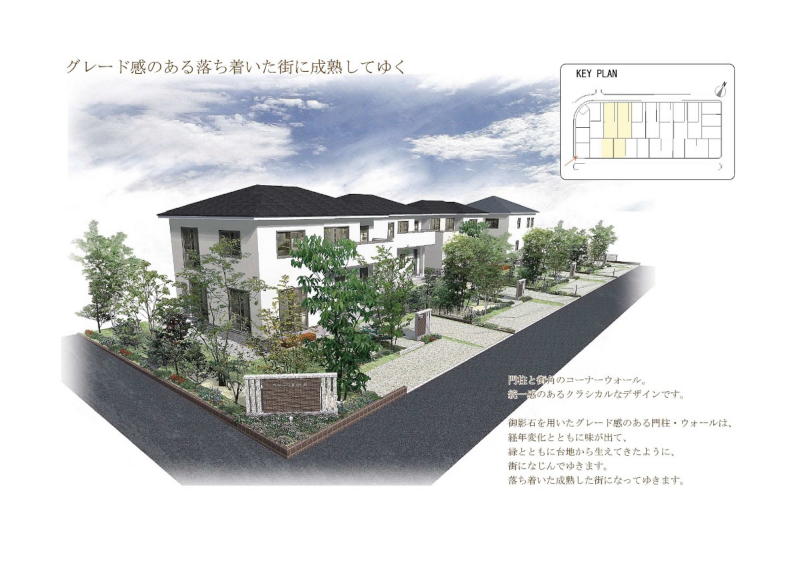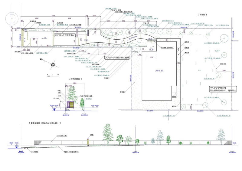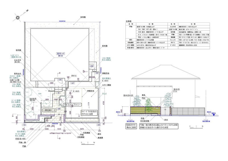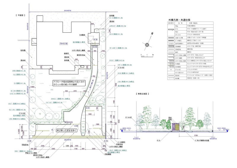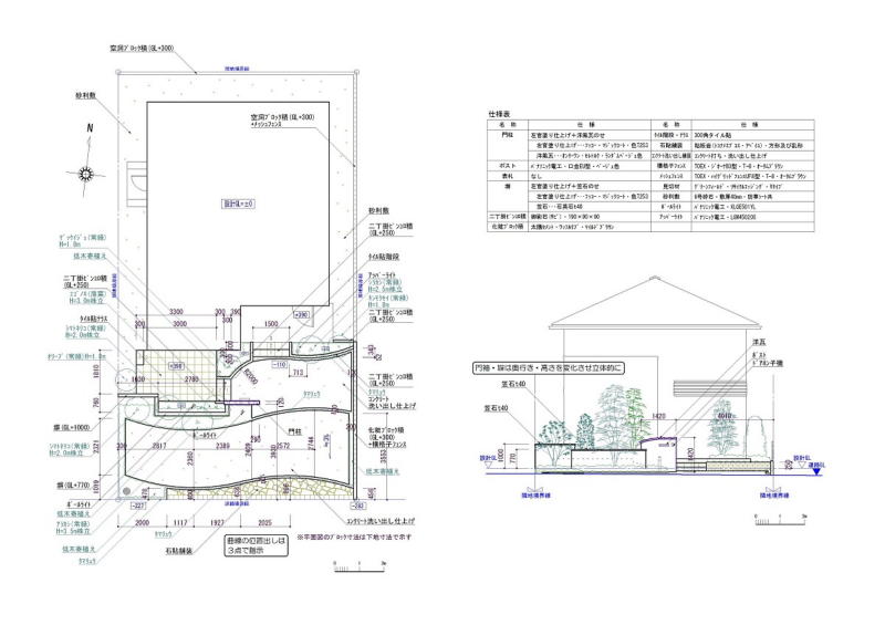 | 洋瓦をのせた門袖と床に曲線を取り入れた外構 |